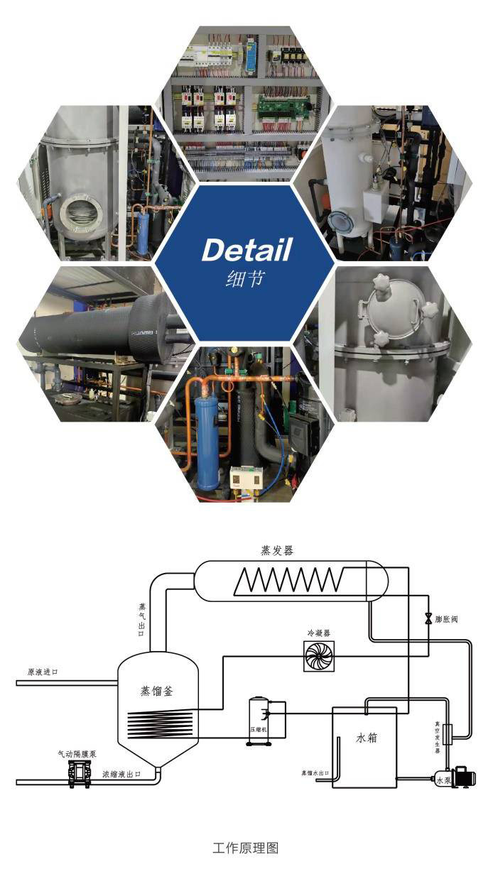 主要功能是在真空负压作用下把沸点降低,使原液加热后在三十多度沸腾蒸发,蒸发出来的蒸汽经过冷凝系统凝结成液态水通过排水槽排出,根据水质比重的不同浓缩减量出水率******可以达到95%。通过该设备浓缩减量处理,可以大大减轻企业废液处理的成本,并且设备占地面积小,移动便捷,自动化程度高,无需外接蒸汽源与外围冷却水,只需提供电能与少量压缩空气即可。