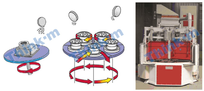 转台式抛丸机一般用于单面或有一面不需要抛丸处理的产品,设备分为行星式转台和单一转台旋转,要求高的产品一般选择行星式转台抛丸机,产品互不磕碰,并独立运行;如轮毂、齿轮强化、膜片弹簧强化等产品。大件选择单一转台抛丸机,其载重量1吨~150吨位,台面直径可达6米一般处理大型铸件、结构件等。主要用于风电行业。